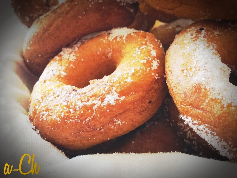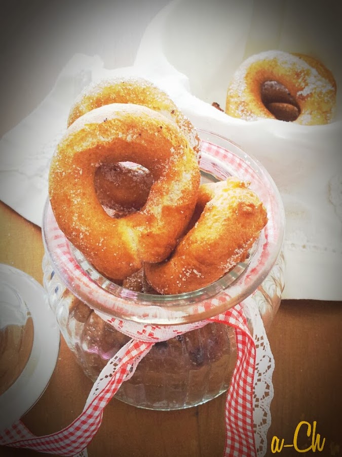 En un bol echamos todos los ingredientes de la lista menos la harina, que la echaremos al final. Lo batimos con una batidora y cuando tengamos la mezcla, incorporamos poco a poco la harina (la que vaya requiriendo la mezcla), vamos removiendo con una cuchara de madera, y cuando ya no podamos remover con la cucharada, usaremos las manos para amasar un poco. Es preferible, según me dice mi madre, que la masa se pegue un poco a las manos, ya que si no, quedarán muy duras. Vamos cogiendo pequeñas porciones de masa y hacemos churritos, unimos los dos extremos y hacemos las rosquillas. Ponemos al fuego una sartén con abundante aceite y las freimos por ambos lados, que se doren. Las iremos dejando en un plato con papel absorbente y cuando estén templadas, las echamos azúcar por encima (hay quien las reboza en azúcar, pero para mi ya era demasiado). Las conservaremos en un tarro de cristal.