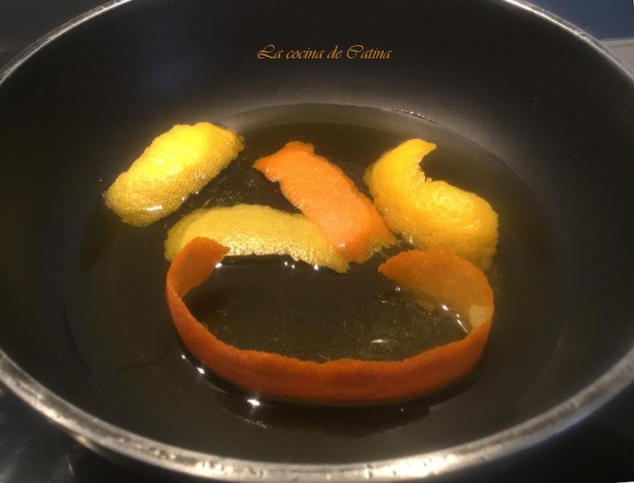 Ponemos el aceite a calentar en una sartén y freímos en él las pieles de limón y naranja, dejamos enfriar.