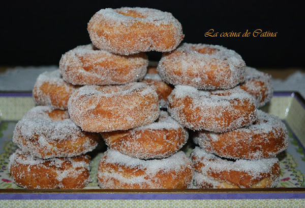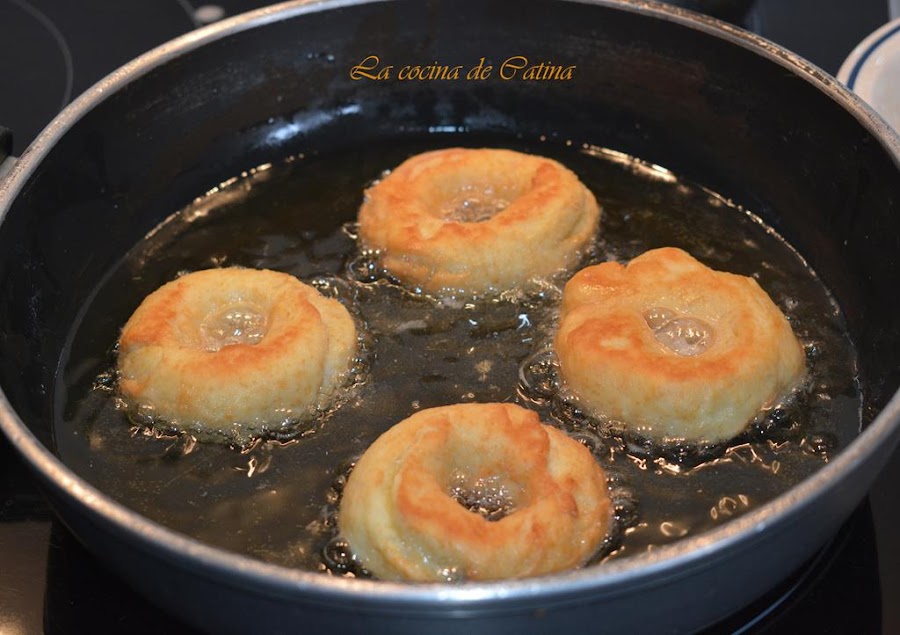 Calentamos abundante aceite en una sartén y las vamos friendo por tandas, las vamos pasando a un plato con papel absorbente y antes de que se enfríen se van pasando por azúcar.