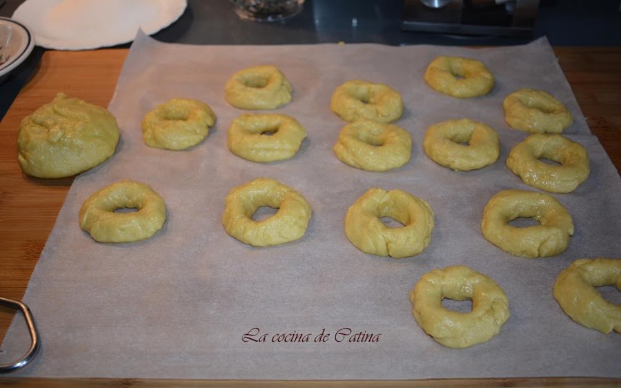 Nos untamos las manos en aceite y vamos cogiendo porciones del mismo tamaño le hacemos un agujero en el centro metiendo el dedo. Los vamos colocando encima de un papel de horno hasta que los tengamos todos.