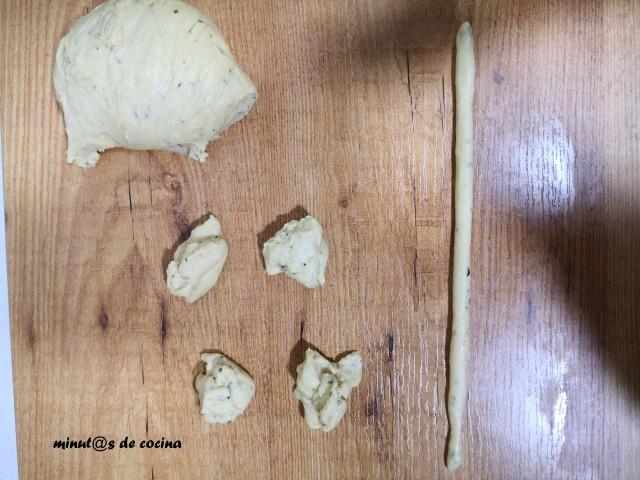 Amasar un poco más, que quede una bola fina y sin grumos. Cortar trocitos de unos 15 gr cada uno.