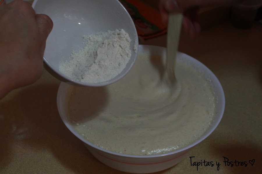 Y empezamos a añadir la harina. vamos añadiendo hasta que conseguir una masa que no se pegue.