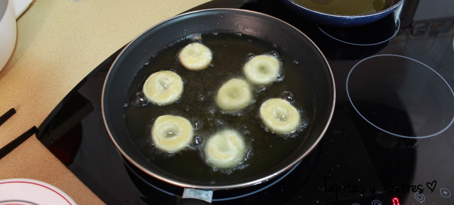 Ponemos abundante aceite a calentar y sin que llegue a humear freímos los rosquillos dando la vuelta cuando los veamos dorados por un lado.