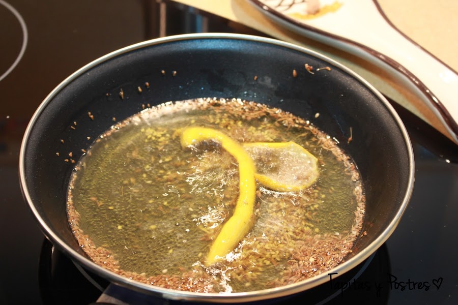 Freímos el aceite con la cáscara de limón, el ajonjolí y la matalauva.