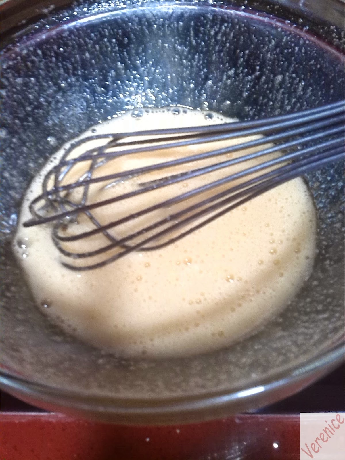 Añadimos la leche y volvemos a batir, seguimos con las varillas