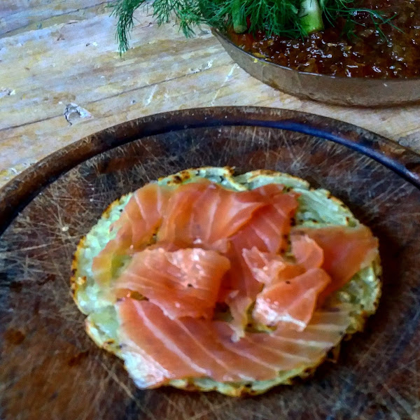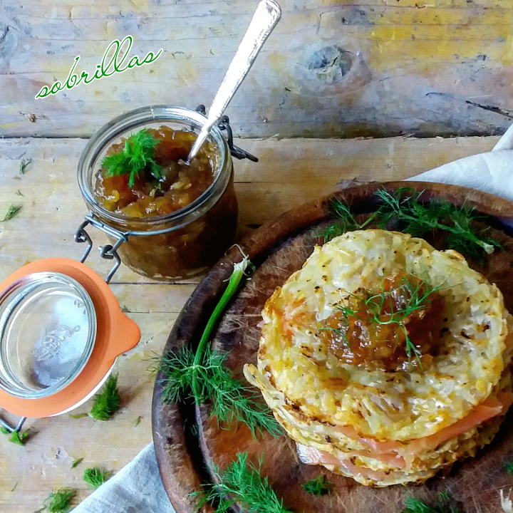 Apilamos los Rostï y servimos en capas alternas de salmón coronadas con chutney de hinojo.