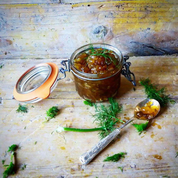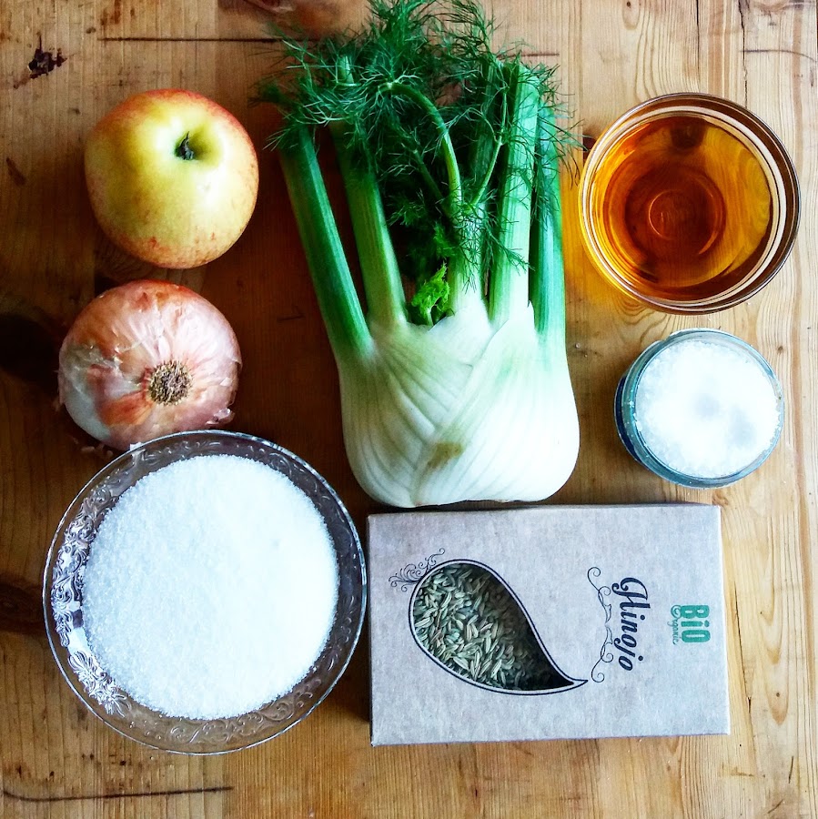 Cortamos en bronua el hinojo y la cebolla y lo pochamos con sal, pimienta y las semillas de hinojo unos 10 minutos hasta que hablande. Añadimos el vinagre de vino y dejamos que reduzca hasta que casi no quede líquido. Entonces ponemos el azúcar y cocemos unos 20 minutos o hasta que caramelice ,veremos que la mezcla hace burbujitas y entonces estará lista.
