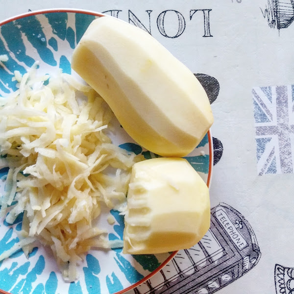 Para hacer el Rostï pelamos y rallamos gruesa la patata, Salpimentamos. Escurrimos y exprimimos la patata para que quede seca. No la ralléis toda a la vez porque se oxidará y se volverá marrón. Mejor hacer de media en media patata.