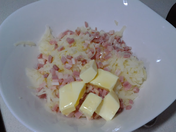 Mezclamos las patatas ralladas con la mantequilla y los taquitos de bacon y formamos tortitas aproximadamente del mismo tamaño.