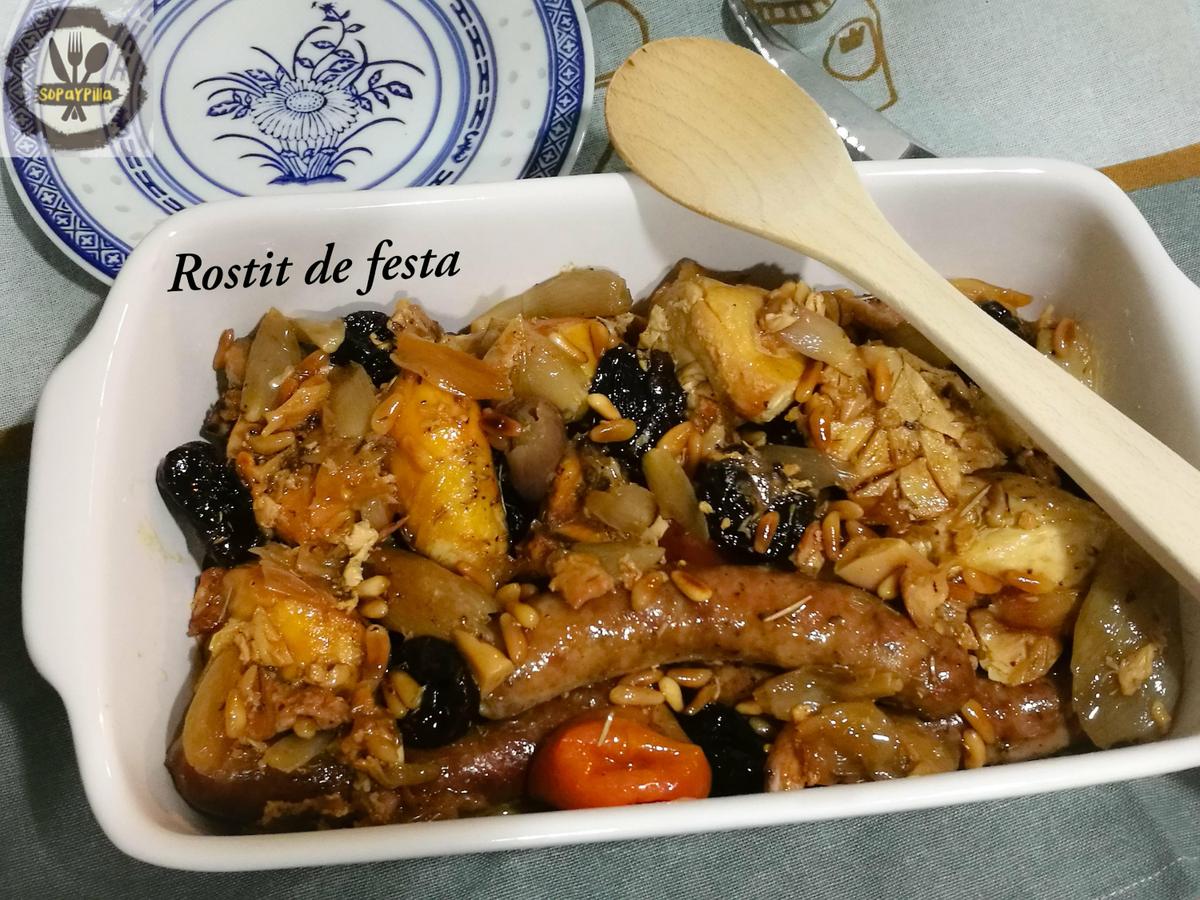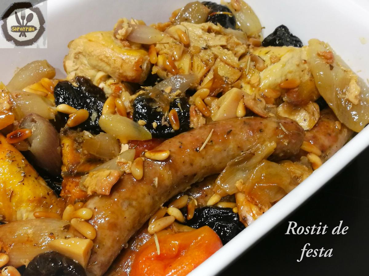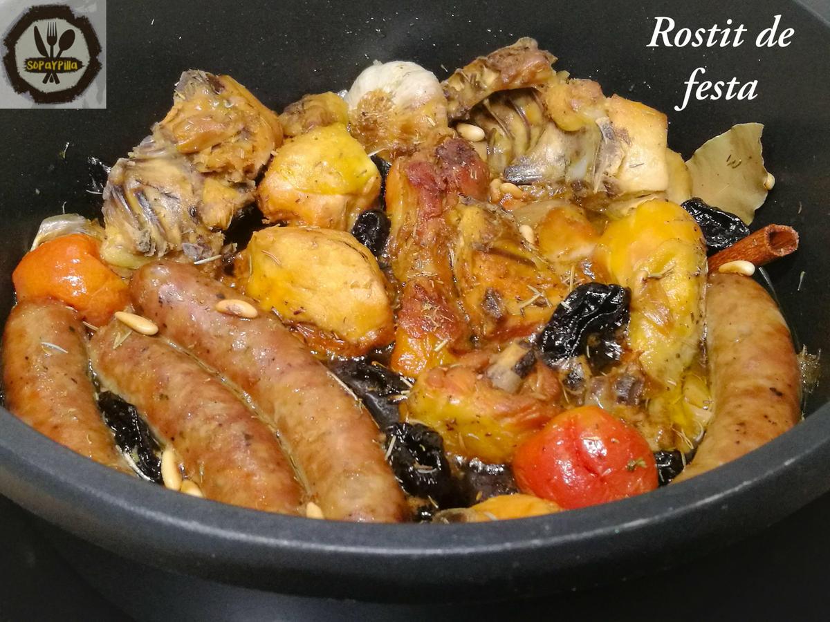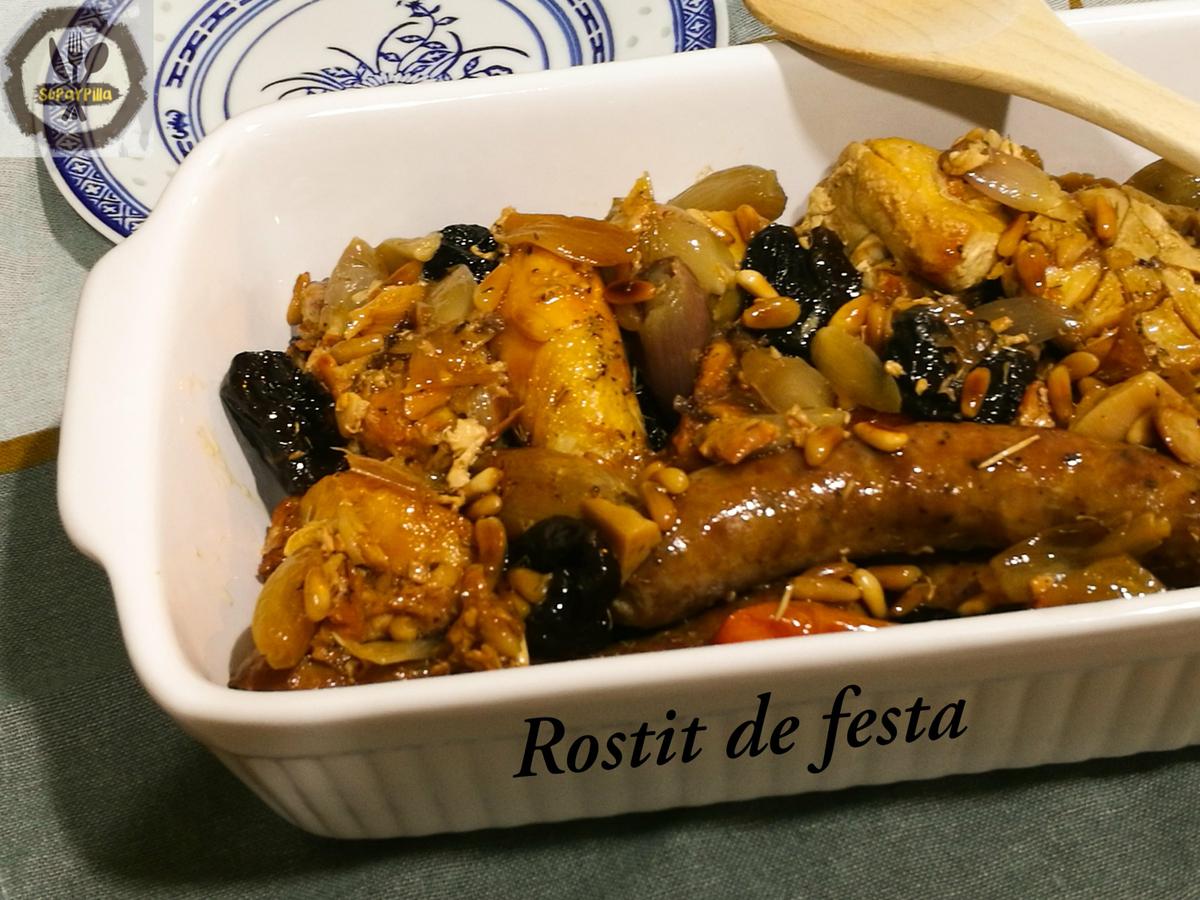El rostit a la cassola (la traducción literal sería asado en la cazuela, no confundir con un asado al fuego o en el horno) es el plato más tradicional de las fiestas mayores, sobretodo en los pequeños pueblos, también es un plato típico de Navidad. Si todavía no sabéis que preparar para estas fiestas, os propongo un plato principal típicamente català y con el que todos se chuparán los dedos. Es habitual prepararlo con pollo y butifarras, pero también se pueden mezclar en la cazuela diferentes carnes: pato, conejo, costillas de cerdo, lomo, cordero, ternera…