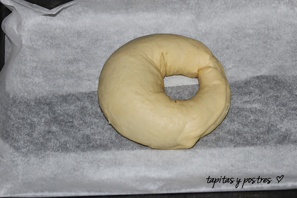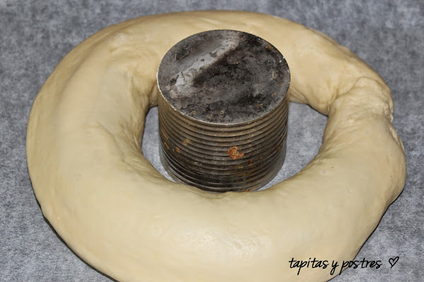 Enrollamos como si fuera un brazo de gitano y enroscamos. En la unión damos unos pellizcos a la masa para que se unan los bordes. Podemos poner en el centro un aro o algo que impida que el agujero se cierre porque va a crece mucho.