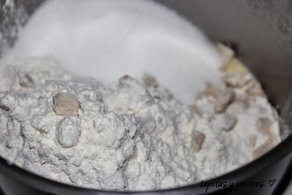 Agregamos la harina, levadura, sal y azúcar. Amasamos.