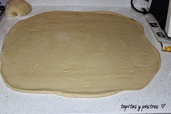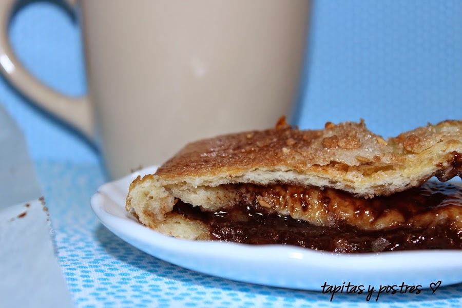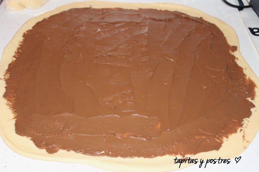 Estiramos bastante, en forma de rectángulo, finita y cubrimos abundantemente con nocilla o nutella.