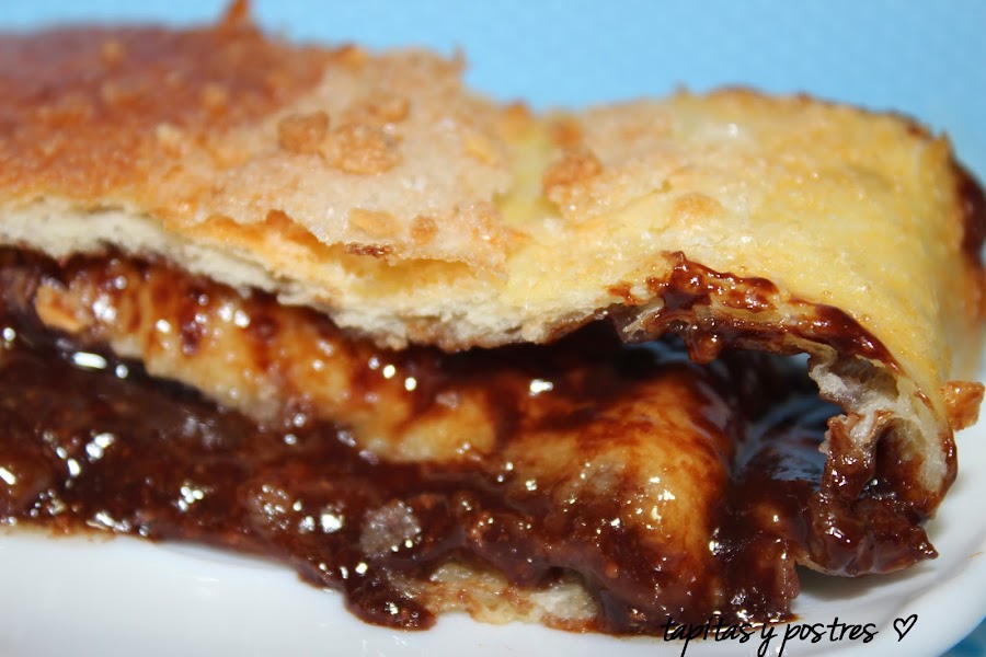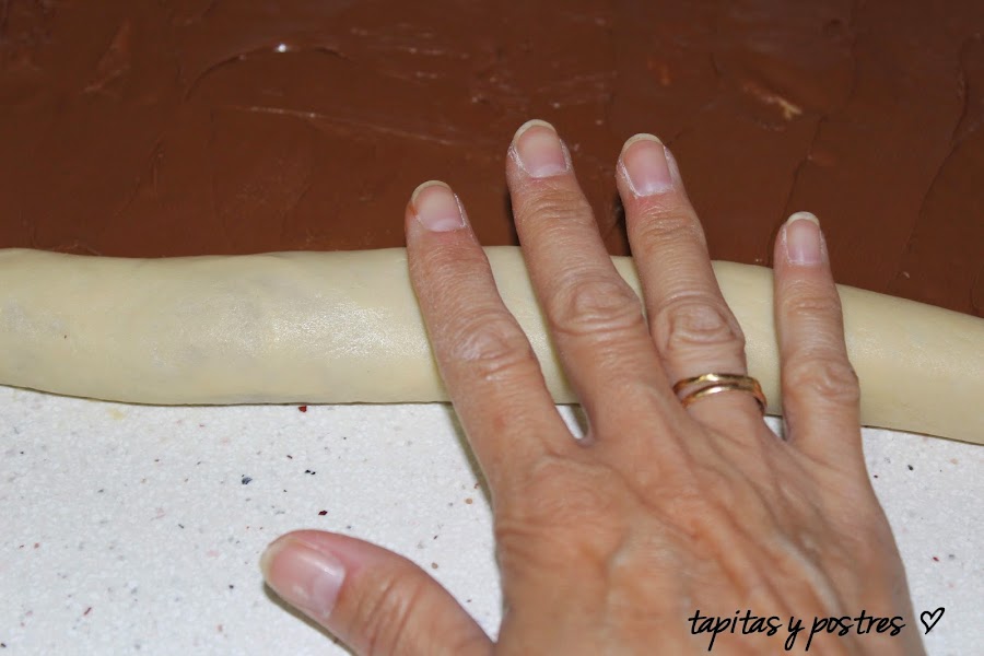 Este es, posiblemente, el dulce más demandado por mis compañeros de trabajo. Al menos para dos de ellos, Pepe y Olga, que me lo reclaman siempre. Y es que este Rotollo alla Nutella, no es otra cosa que un hermoso y delicioso rosco de nocilla, pero si uno lo dice en italiano, como que el postre gana en refinamiento y glamour. Cosa por otro lado que no necesita, porque se trata de un dulce que triunfa siempre, si te gusta el chocolate.