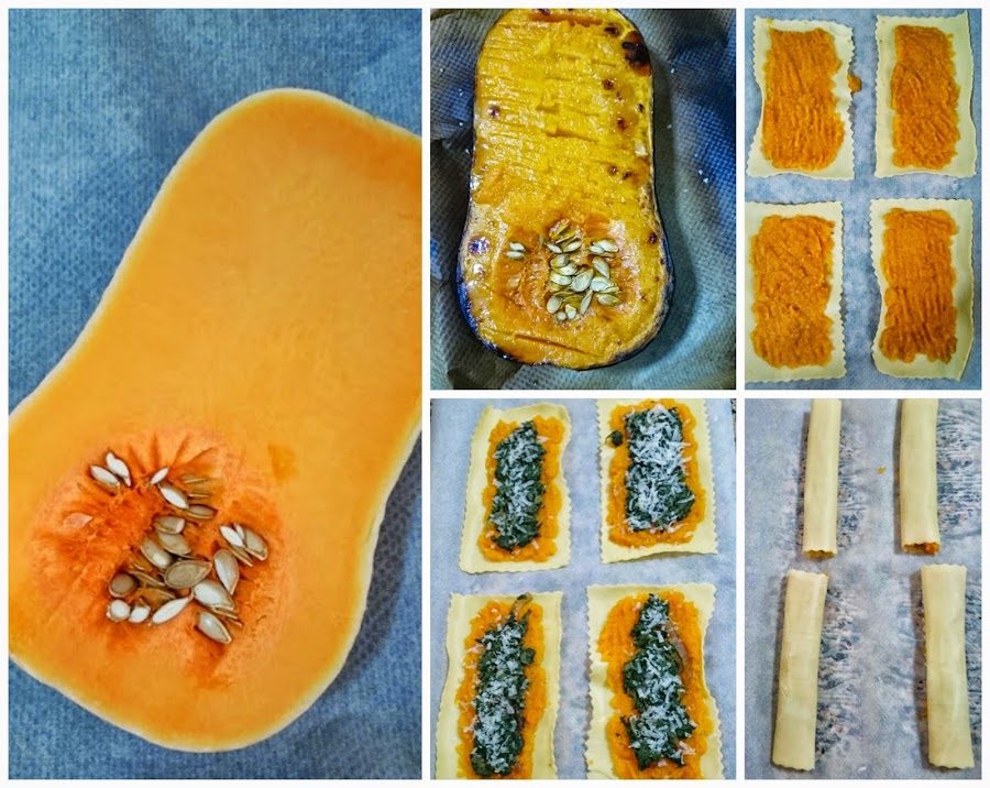 8. Extendemos las hojas de pasta y cubrimos con una capa de calabaza, después ponemos otra de espinacas y encima añadimos el queso (el que hayáis usado). Enrollamos las hojas como si formáramos un canelón y después cortamos en rodajas cada uno.