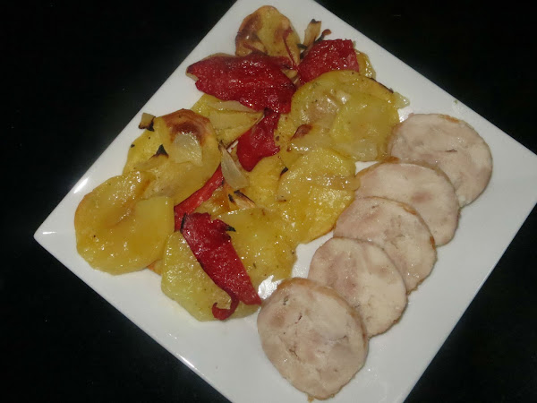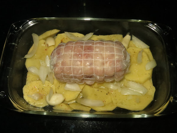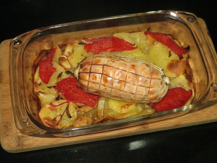 Lo metemos al horno durante 25 minutos hasta que veamos que comienza a dorarse, ahora lo sacamos le damos la vuelta, añadimos los pimientos cortados en trozos y el vino que nos quedaba, lo dejamos otros 25 minutos o hasta que esté dorado, lo sacamos y ya está listo para servir. Se parte en rodajas y se acompaña con las patatas, la cebolla y los pimientos.