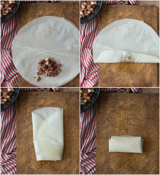 Yo he usado dos hojas de masa por rollo, porque nos gusta mucho es sensación crujiente, pero si quieres hacerlos más ligeros, con una bastaría.