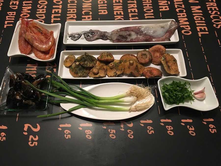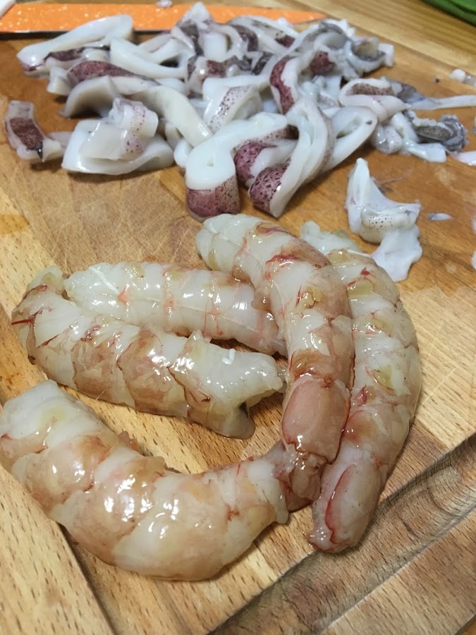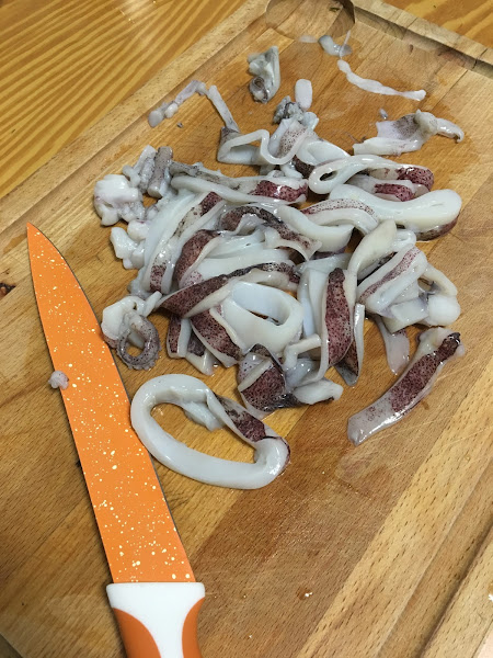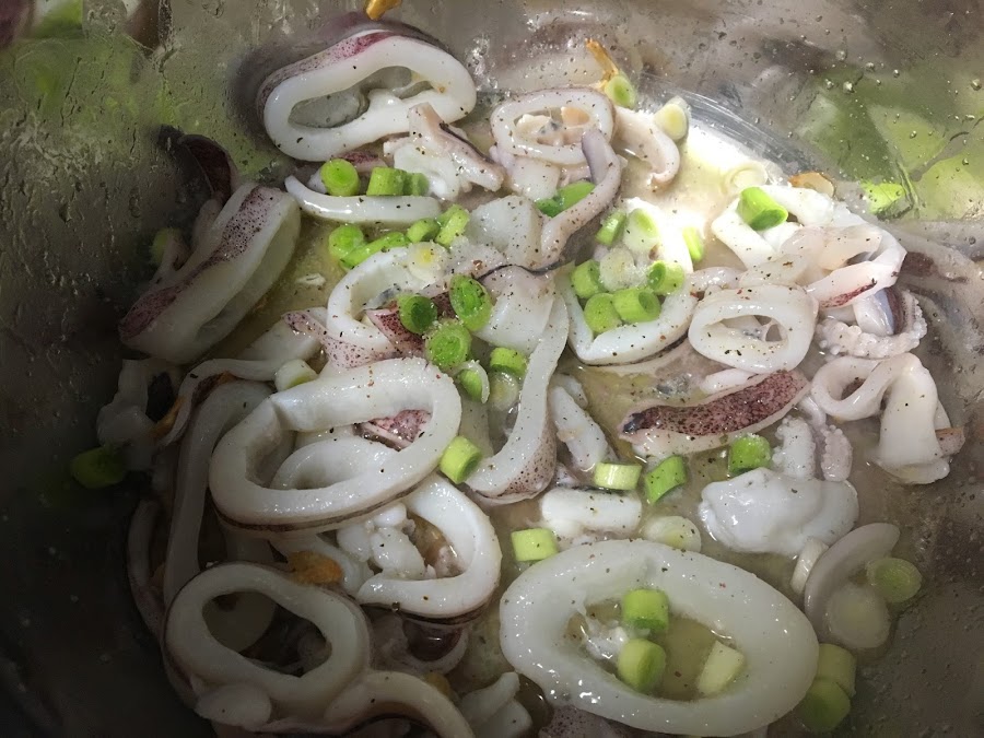 Mientras los revellons se van haciendo limpiamos y cortamos el calamar en aros. También limpiamos y cortamos los ajitos tiernos en trocitos pequeños.