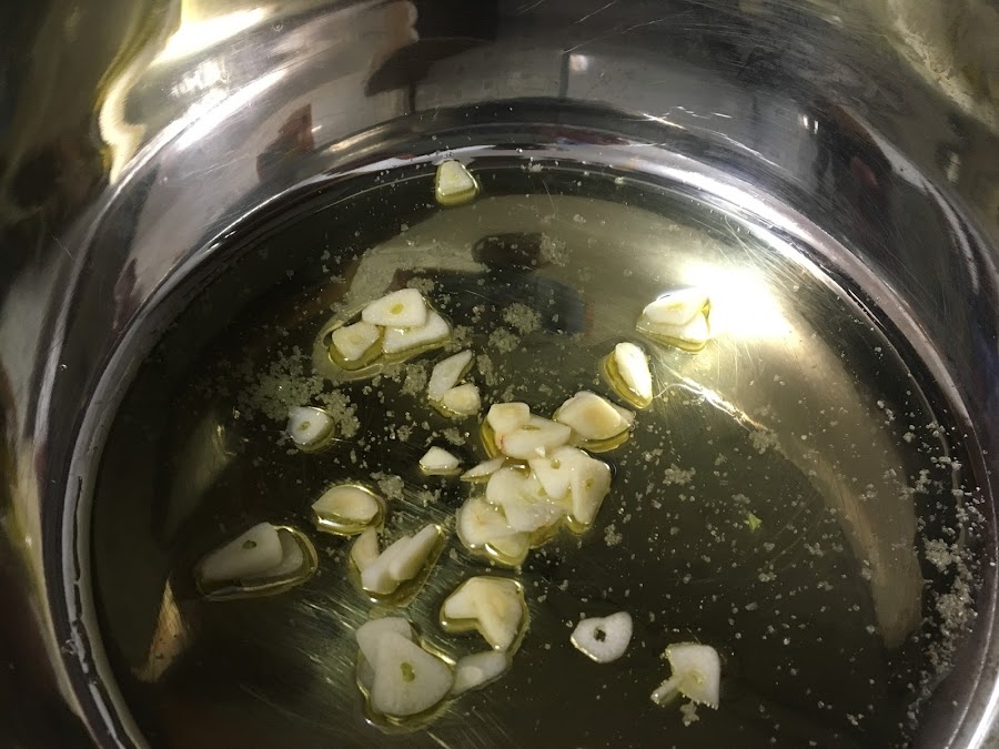 Ponemos aceite de oliva virgen extra en una olla, pelamos y fileteamos dos ajos los introducimos con un poco de sal en el aceite.
