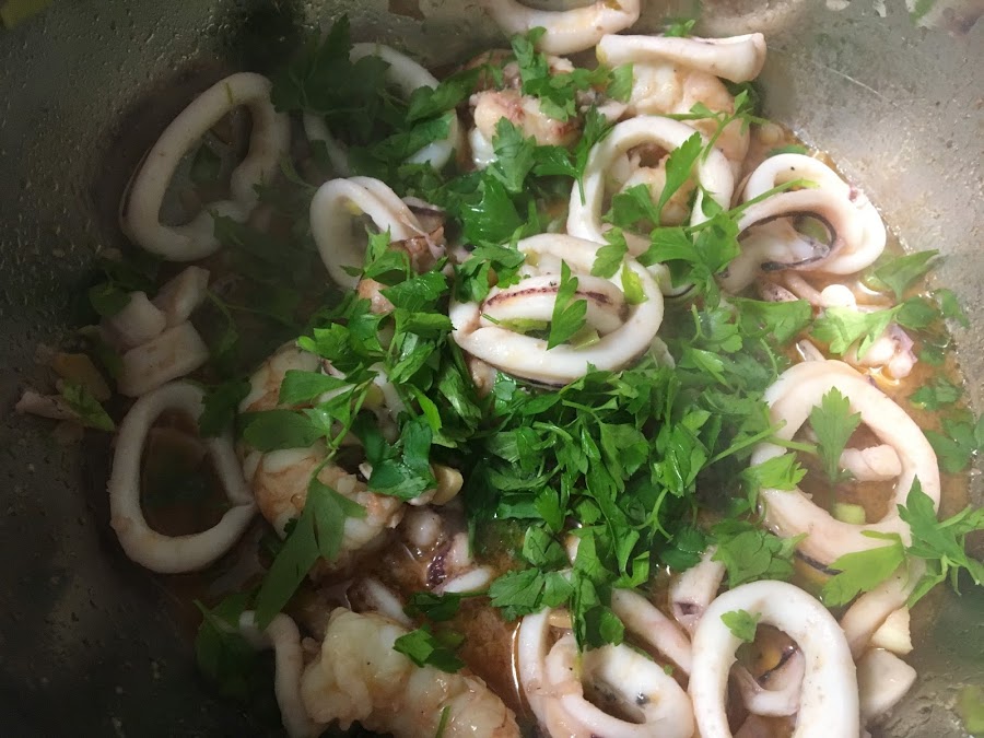 Cuando las gambas van cogiendo color añadimos un puñado de perejil picado y los removemos todo.