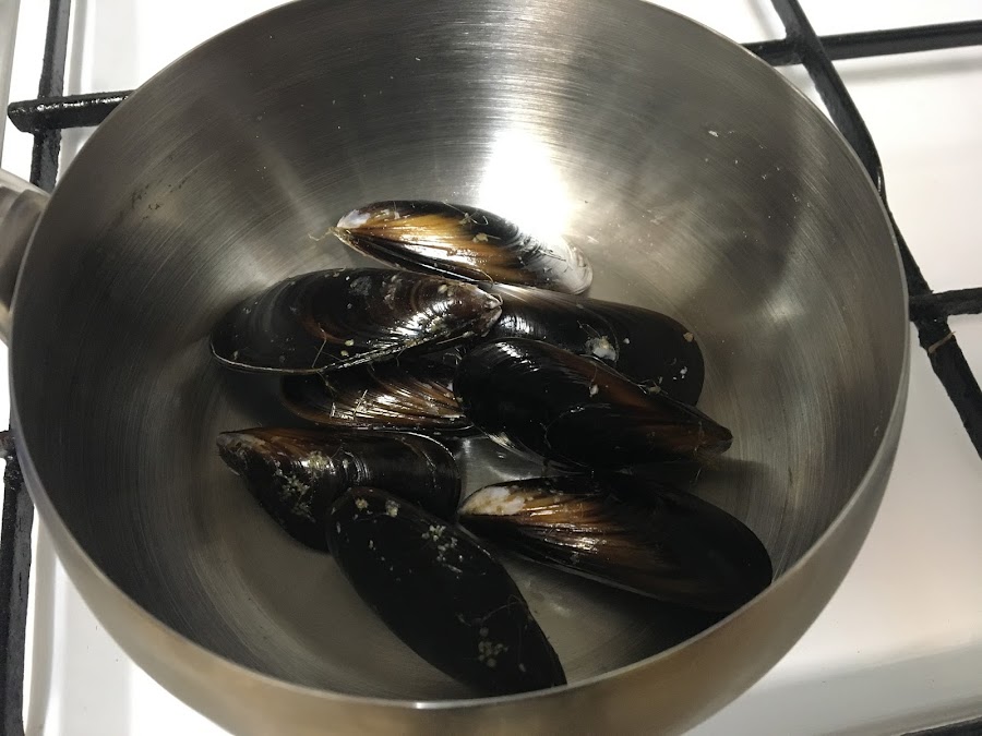 Limpiamos los mejillones y los ponemos en un cazo a fuego rápido unos 4 minutos hasta que se abran. Cuando estén abiertos los retiramos del fuego y los reservamos.