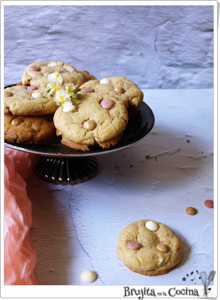 Como ya hace frío he especiado un poco la masa con nuez moscada, porque este aroma así como la canela, jengibre o cardamomo me recuerda al invierno, al frio a la Navidad. Pero hoy no son galletas con pepitas de choco oscuras, hoy le damos toque con pepitas de chocolate ruby, también algo de blanco y gold, yo estas siempre las compro en Hielo Granel, porque Jenny es tan maja y tiene tantas cosas ricas que a mi me gustan, y lo mas importante es la calidad.
