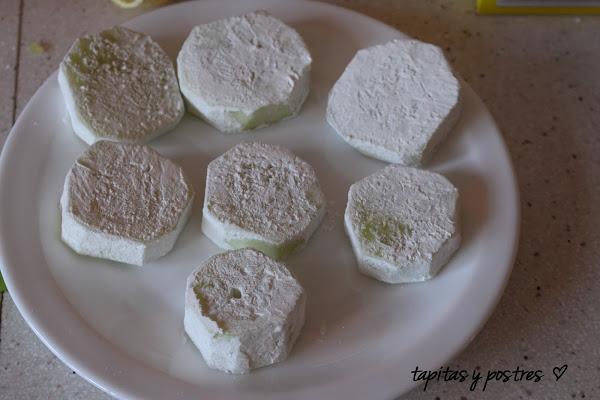 Corta el pepino en rodajas gruesas, pásalas por la maicena y déjalas en un plato.