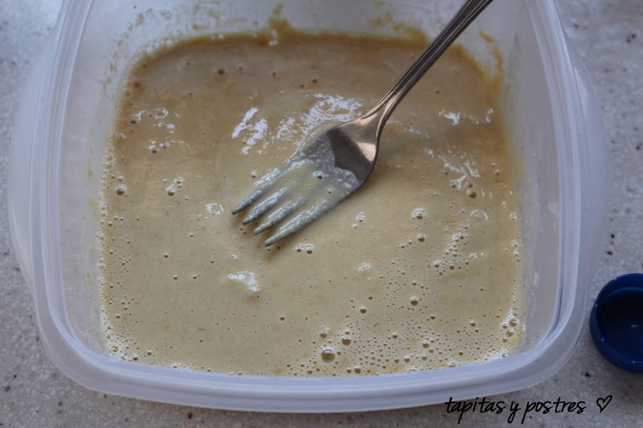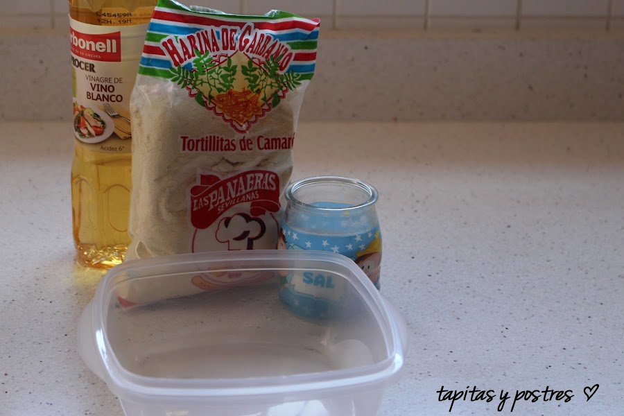 Mezclamos la harina de garbanzos, el vinagre y sal y añade el agua poco a poco hasta formar una crema poco densa como si fuese huevo batido).