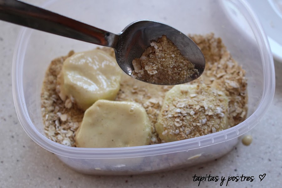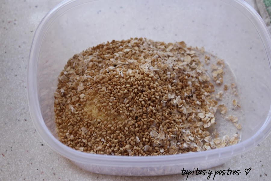 Y después las rebozamos en la mezcla de pan rallado, avena, sésamo y sémola.
