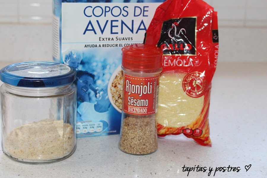 Mezclamos en un recipiente aparte el pan rallado, los copos de avena, la sémola y el sésamo.