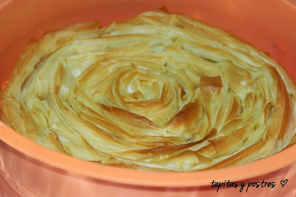Hacemos lo mismo con el resto de las hojas. Hay que ir pintándolas con rapidez pues la masa filo se seca muy pronto. Cuando tengamos otra hoja pincelada con mantequilla, la enrollamos alrededor del "centro" que ya hemos puesto antes.