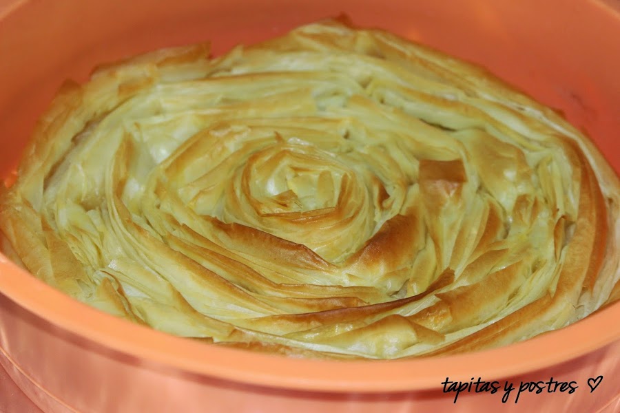 Vertemos esta mezcla, con cuidado sobre la tarta recién horneada. La crema se mete entre las capas de la masa filo y al cuajar se forma una textura densa y suave. De vuelta al horno. De nuevo la receta original dice media hora. Yo la tuve unos 18 minutos, ya estaba la crema cuajada, no era necesario más tiempo. Cada uno que controle los tiempos de su horno.