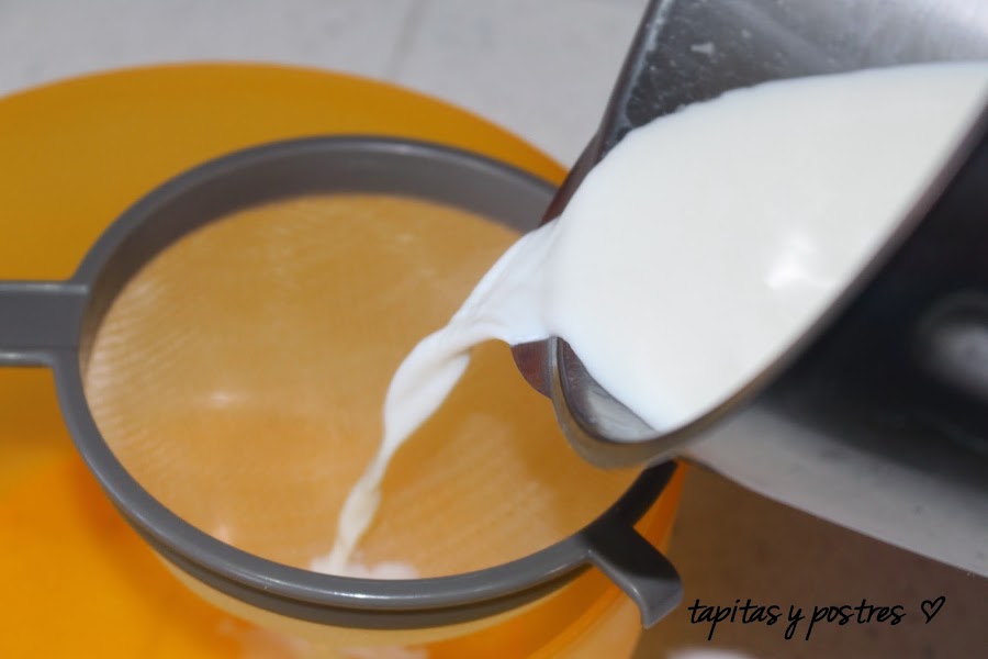 Colamos y reservamos aparte, mientras, sin lavar el vaso, batimos los huevos con el azúcar dos minutos, a velocidad 4. Cuando lleve un minuto batiéndose, echamos por el bocal la leche y dejamos que se mezcle todo bien.