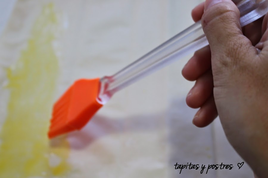 Desenrollamos las hojas de masa filo y vamos pintando cada una con la mantequilla fundida.