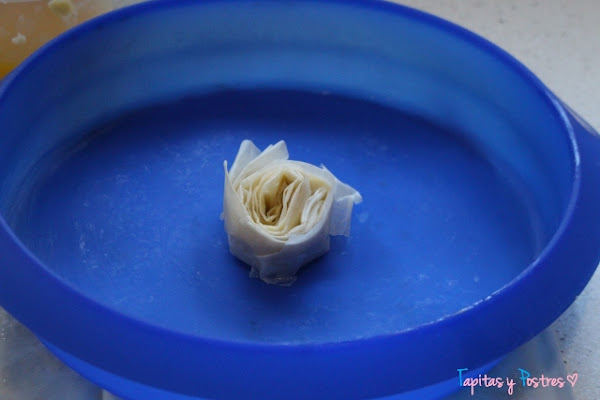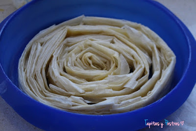 Y el resto de las hojas enrolladas las iremos colocando alrededor de la primera. Así hasta acabarlas todas. Como véis, mi molde era un poco más grande y las hojas de masa filo no lo cubrieron por completo. Pero no importa, la crema lo cubrió todo después. Ahora horneamos diez minutos a 180º en el horno.