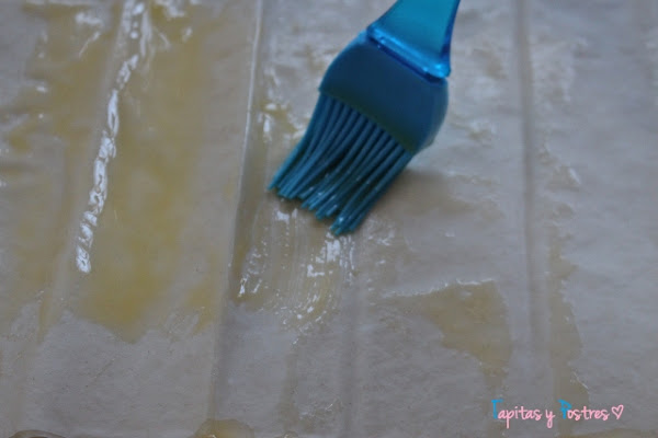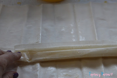 La masa filo es delicada para trabajar porque se seca muy rápido una vez que se saca del envoltorio. Así que hay que pincelar con la mantequilla fundida con rapidez.