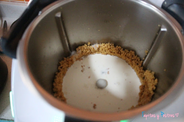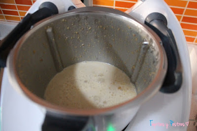Le añadimos la leche, la nata (crema de leche) y el azúcar y mezclamos 30 segundos a velocidad 4.