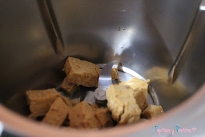Mientras se hornea haremos la crema de turrón. Lo primero será triturarlo. Yo lo he hecho con thermomix, 10 segundos a velocidad 4 y medio. Podéis hacerlo con una picadora o batidora.