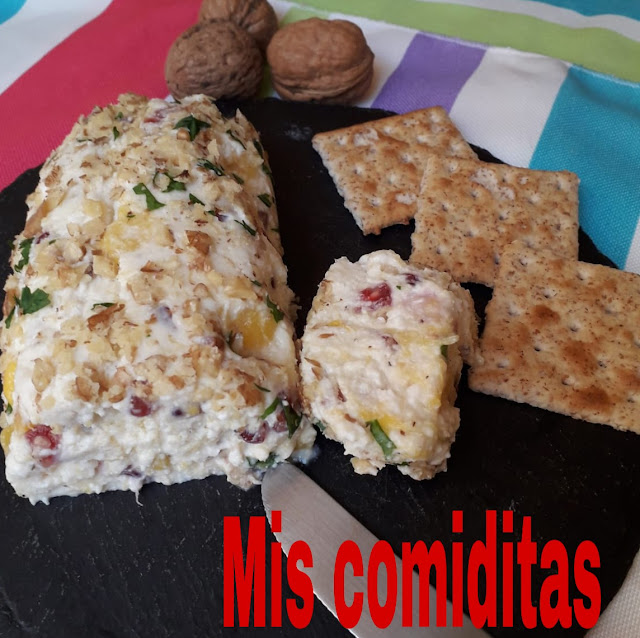 Pues hoy con mi receta uno varios de estos productos tan nuestros. Un sencillísimo pero riquísimo rulo de queso fresco de cabra relleno con mango y granada y recubierto con un poco de perejil y nueces picadas.