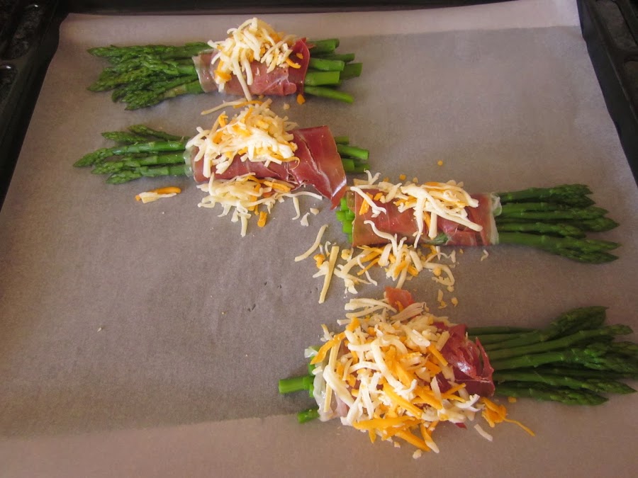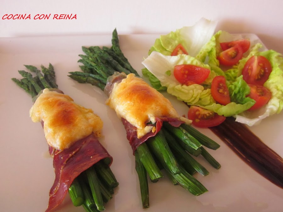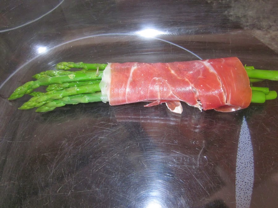 Estiramos el jamón y dependiendo del grosor de los espárragos,hacemos unos rulitos,como veis yo puse 5 o 6 espárragos.
