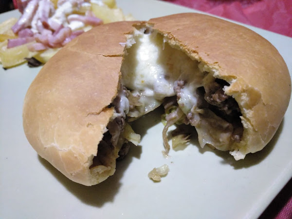Extendemos la masa de forma circular y ponemos en el centro una loncha de queso y una sexta parte del relleno.
