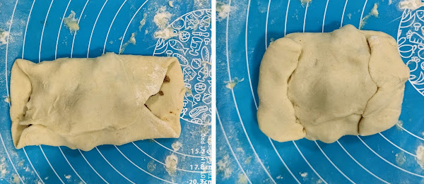 Estiramos cada bola con un rodillo intentando que quede con forma de rectángulo. En el centro añadimos un trozo de queso y una buena cantidad de relleno, hay que ser generoso, ya que si no tendremos un pan con dos cachitos de carne y un poco de repollo.