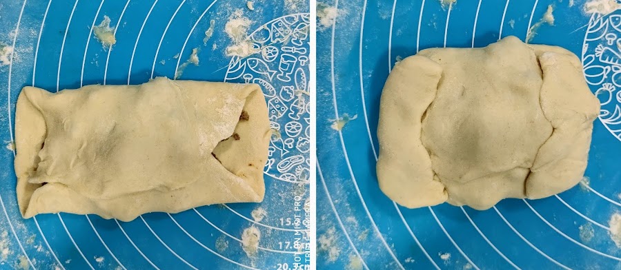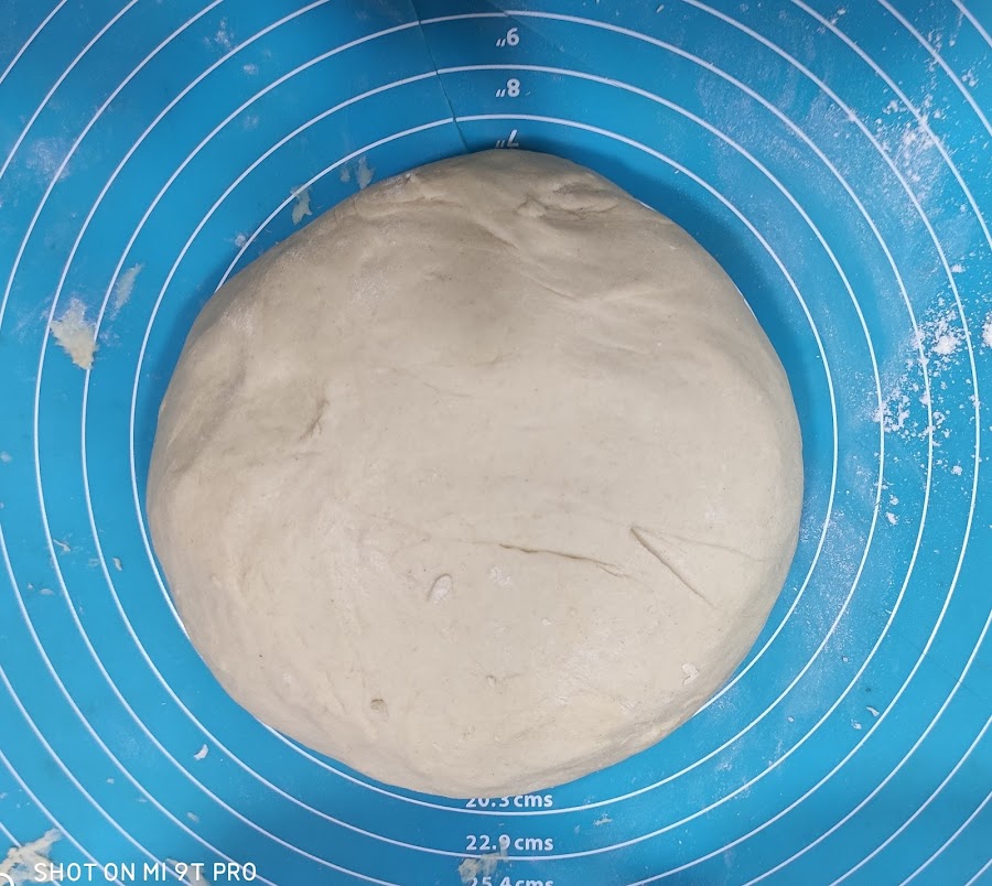 Cuando la masa haya subido ponemos en una superficie enharinada y amasamos ligeramente.