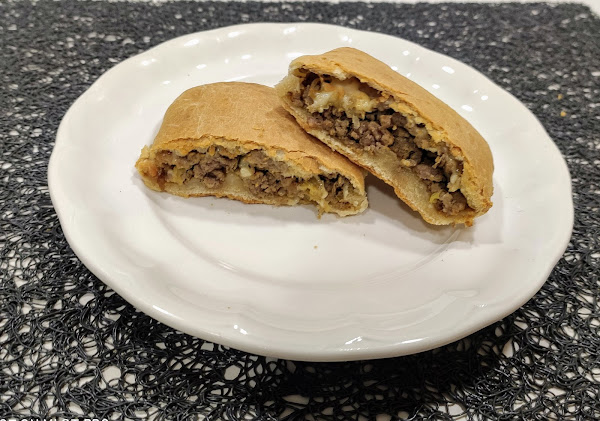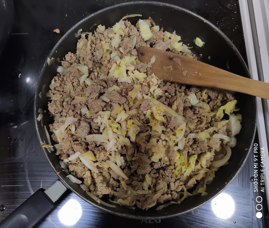Mientras dejamos reposando la masa, pasamos a hacer el relleno. Partimos la cebolla en rodajas y picamos el repollo. En una sartén a fuego medio calentamos un par de cucharadas de aceite y pochamos la cebolla unos 10 minutos con cuidado de que no se queme. Añadimos la carne y el repollo y salpimentamos al gusto. Removemos bien todo y seguimos cocinando hasta que la carne esté hecha y el repollo esté blando.