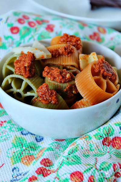 Y hoy miércoles vuelvo con una receta de pasta. Ruote Tricolore al pesto rojo de avellanas.