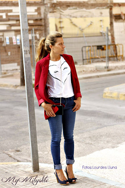El primer look de hoy viene de la mano de Saldivina es un look Urbano muy cómodo y sobretodo funcional. Los Blazer ,las Americanas, las chaquetas son imprescindibles en cualquier época del año, esta vez hemos elegido un blazer con solapa un poco mas largo de lo normal, color "vino- burdeos" muy de invierno que combinado con una simple camiseta de algodón viste genial, te sientes muy cómoda y el conjunto es elegante