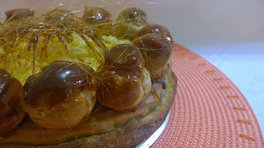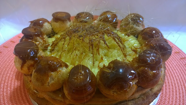 Para el armado final, hacer el caramelo, pasar por él la parte superior de las bombas y dejarlas secar. Hacer un agujerito en cada una con el dedo y rellenarlas con la pastelera para pegarlas por todo el borde del disco de hojaldre cocido.