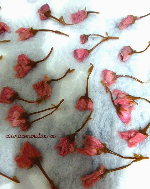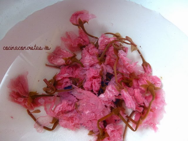 Lo primero es dejar unas 8 horas las hojas de sakura en remojo, para desalinizarlas lo máximo posible (las dejé toda la noche y al agua le añadí 1 cucharada de azúcar).