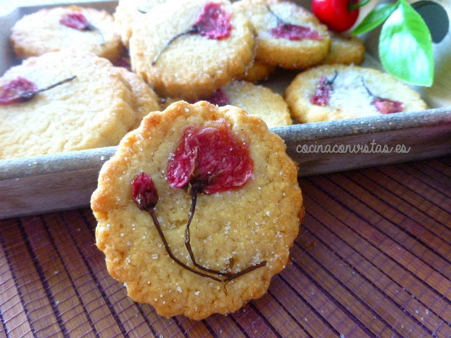 Acabamos de cortar las galletas. Colocamos, con cuidado y presionando un poquitín, las flores encima de las galletas y llevamos al frigorífico 15 minutos (yo las tuve 5 en el congelador).