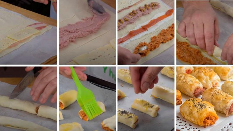 En primer lugar vamos a extender la masa de hojaldre y la dividimos a lo largo en 4 partes iguales. Nos deben de quedar 4 tiras largas.Ahora, vamos a rellenar cada una de las tiras con los ingredientes que hemos elegido, dejando un poco de espacio de un dedo aproximadamente a cada lado de nuestra tira de hojaldre. Colocamos el relleno lo más centrado posible.